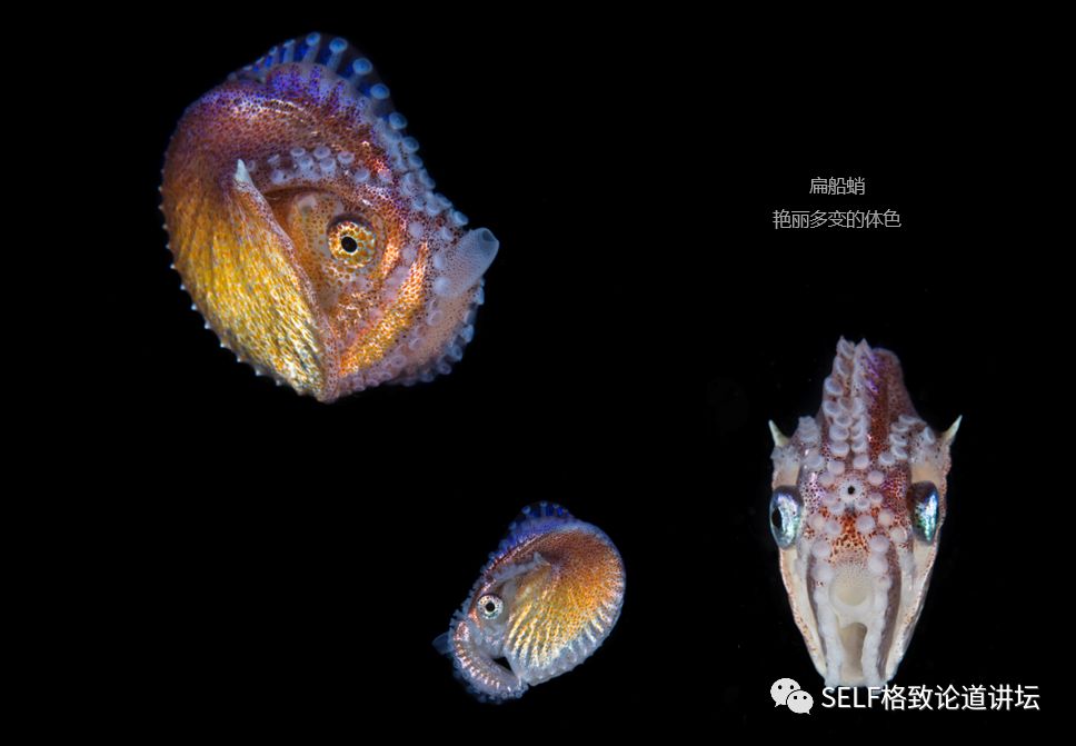 这是扁船蛸,一种很有意思的远洋章鱼,它的雌性会分泌出一种保护卵的壳,这个壳像纸一样薄,又叫做纸鹦鹉螺。壳又被它触手之间的薄膜包覆,会幻化各种色彩,当它紧张的时候可能会发白,它兴奋的时候会变成七彩色。