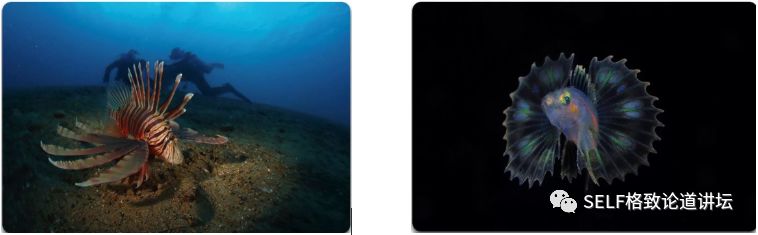 狮子鱼也是常见的珊瑚鱼类,它小时候非常华丽,就像穿着一身跳舞的戏服一样,实际上这是它的胸鳍,胸鳍上面的颜色像绽放的烟火一样。根本无法想象小时候它有这么一套华丽的服装,为什么长大之后就变得这么“挫”呢?