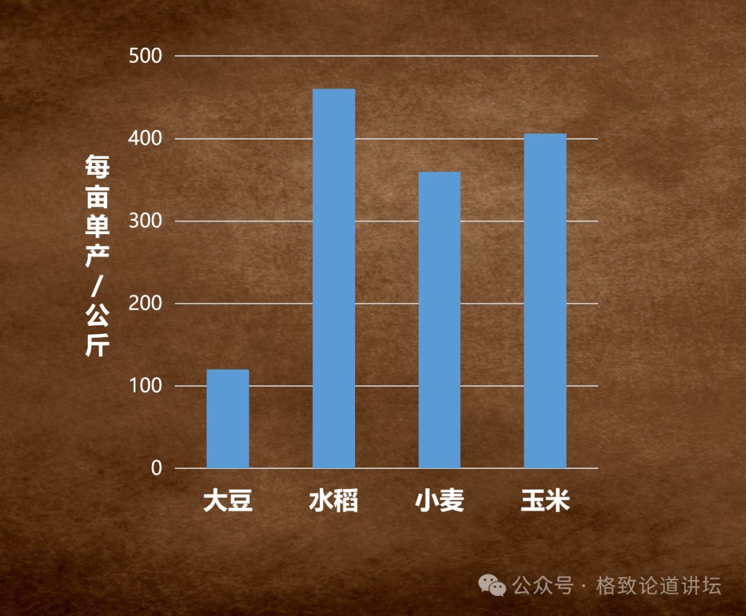 大家可能又要问,为什么我们要进口大豆,而不是其他粮食呢?这就要回归到大豆本身的问题:大豆的单产相较其他主粮作物实在是太低了。