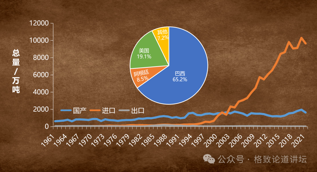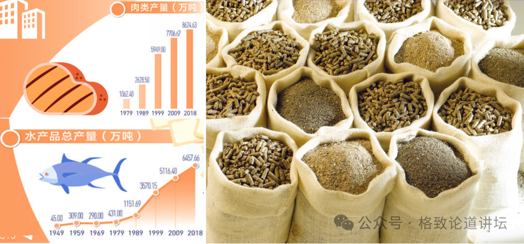 其实,这些只是我们能看到的大豆,还有一些大豆消耗是我们见不到的、隐形消费的。过去的几十年里,我们的生活水平有了大幅度的提高,对肉蛋奶的消费大大提升。据不完全统计,在过去50年间,肉蛋奶以及水产品总产的提升大概有10倍、20倍甚至几十倍。这些畜禽和水产品需要大量的蛋白质作为饲料。而大量蛋白质来自于哪里呢?都是来自于大豆。这就是为什么我们能消费这么多大豆。