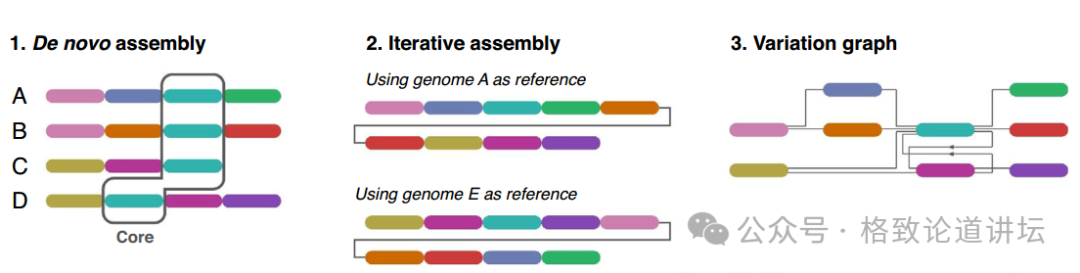 比如我们有ABCD四个基因组,但当我们拼接到一起时候,就像中间这张图展示的,以A的为起点和D为起点所得到的序列是不一样的。