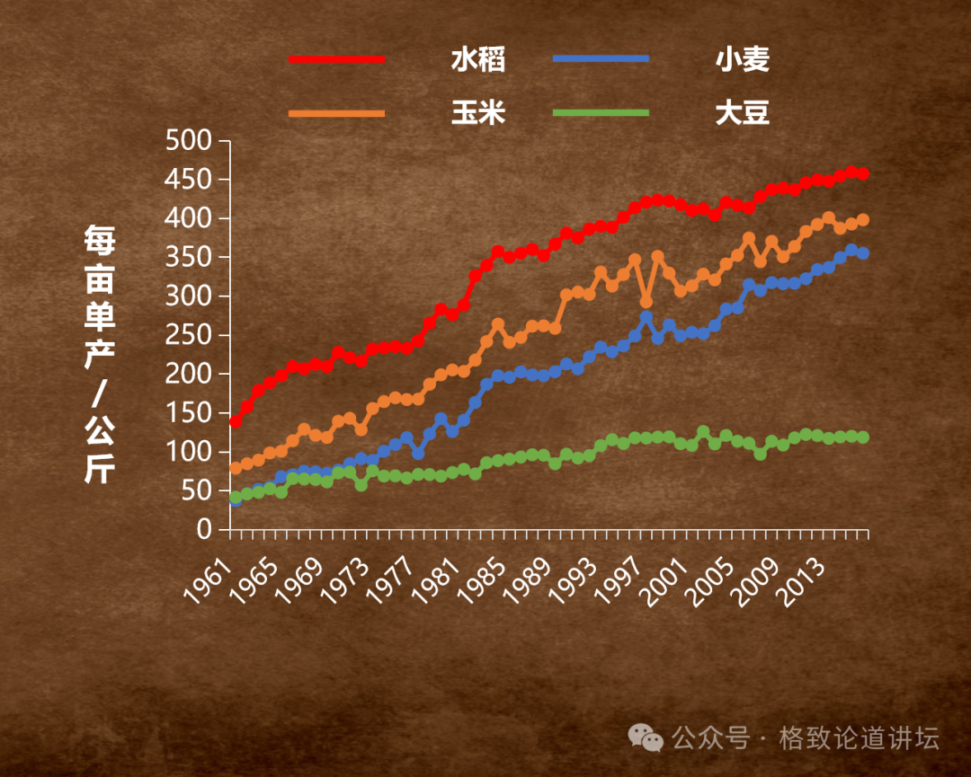 那大豆单产低的问题是不是自古以来就有呢?它和水稻、小麦和玉米的差距一直这么大吗?其实也不尽然。