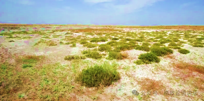 山东东营是一个靠海的、非常漂亮的小城市,那里的盐碱地非常多。这就是当地典型的盐碱地情况,长的都是一些碱蓬。