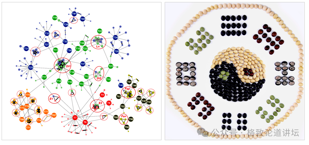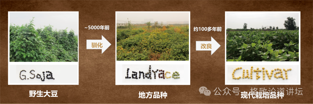 大豆是大概5000年前在咱们中国被驯化的。它被驯化前是野生大豆,就是图里左边这些黑色的小种子,是一种高蛋白植物。我们分析发现,这种高油的特点是经过我们祖先长期选择哪些控制油份基因而慢慢形成的。