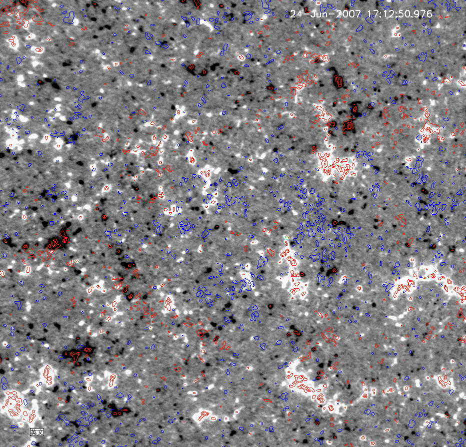 这是太阳没有黑子的地方的磁场和爆发现象,上边是太阳的小尺度磁场,仍然是白色的代表正极,黑色代表负极。各位可以看到像这里最小的太阳磁结构,就相当于一二百公里,这是我和学生们观测到的。