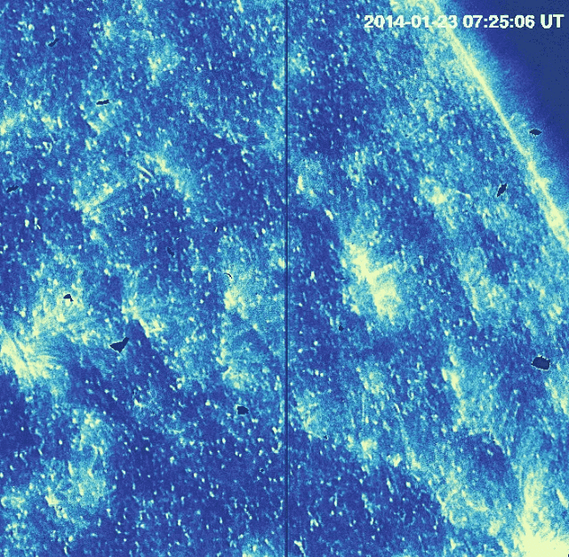 太阳大气是由带电的正离子和电子所组成,它是部分电离的,它受到磁场作用,呈现出了缤纷复杂的结构。上图是我国云南天文台抚仙湖所观测到的太阳边界的日珥现象,大家可以看到太阳的边界与不停爆发的小尺度的针状体。这种小尺度针状体每一个都相当于一个喷流(jet)。我们还能看到飘逸而潇洒的大尺度日珥和一些很奇怪的结构,比如日珥的底边界。