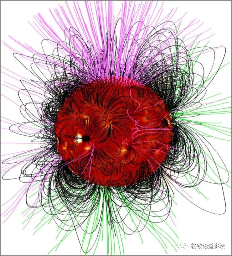这是基于刚才的磁场观测,在一定的理论假定下计算的三维太阳磁场,我们可以看到太阳磁场有非常复杂的拓扑结构和全球范围的连接性。