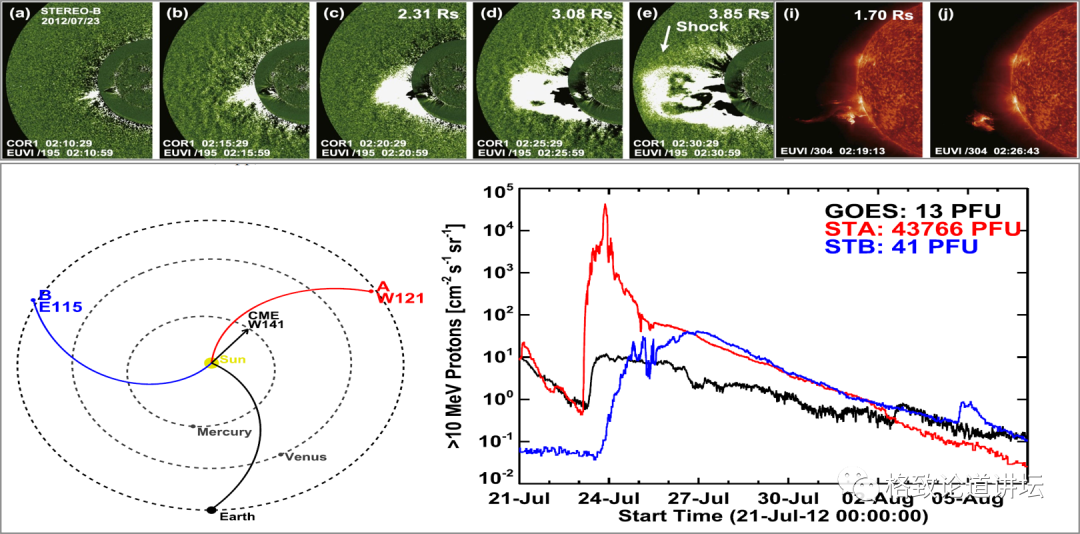但是,在2012年7月23日,人类观测到了另一次卡灵顿水平的强大太阳爆发。大家可能会问,为什么我们没有感受到这次太阳爆发的影响?从图中可以看到,这次太阳爆发和日冕物质抛射是背离太阳而去的,耀斑的源区对地球而言是太阳的背面。
