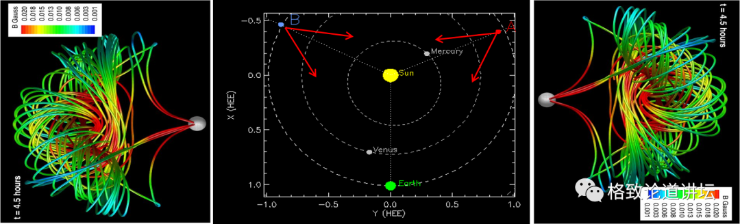 所谓磁云,就是一团扭缠在一起的磁力线和磁场,带着太阳的等离子体即太阳的完全或部分电离的物质抛向行星际空间。我在上图两侧画了扭缠的磁力线和磁环,这是从中图里的两个不同的宇宙飞船中看到的太阳和地球。日冕物质抛射和磁云可以轰击地球的磁层,甚至在比较剧烈的日冕物质抛射中,磁云一直可以到太阳系的边界,影响到太阳系的外行星系统。