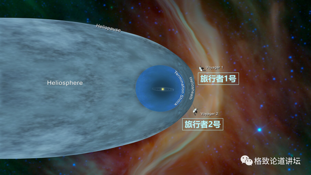 这张图中是太阳和日球,我们把它叫做Sun & Heliosphere。这里可以看到旅行者一号和二号已经飞出了太阳系,正在星际空间和太阳系空间的激波面附近,它还要在星际空间旅行。由于核电池的限制,它只能工作到2027年前后,还会在星际空间里继续工作多年,还会源源不断地传回数据供科学家们使用。