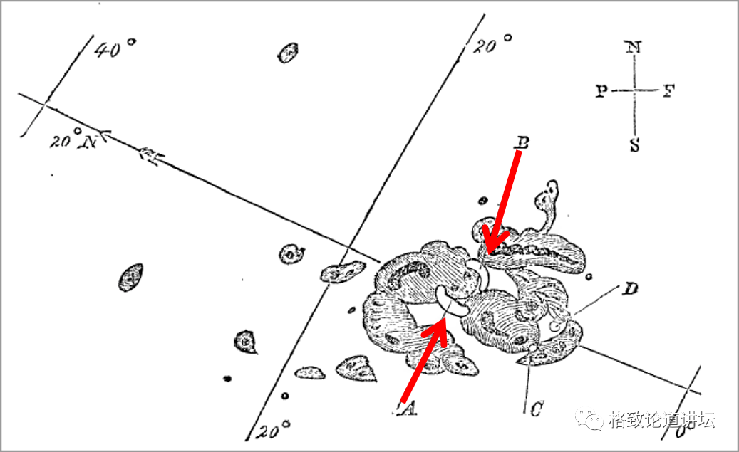 这是卡灵顿发表的一篇文章的插图,两个红色箭头指向他所观测的两个耀斑带。这类耀斑被称为白光耀斑,因为它不需要光谱观测,用积分光即白光,甚至肉眼都能够看见。这个耀斑产生了非常强烈的日地物理效应。