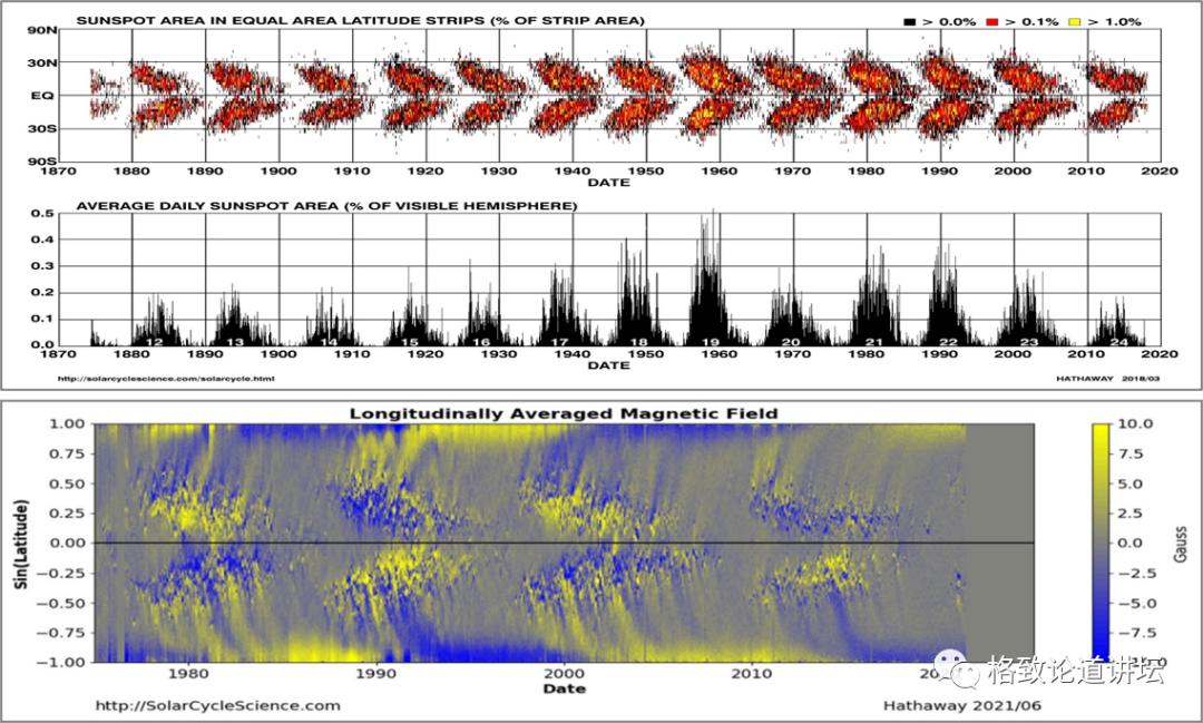 刚刚结束的第24个太阳周,日面上出现黑子数就是中间这幅图里所展示的,差不多是百年来最少的。从上面记录黑子在日面上出现的位置和轨迹的蝴蝶图也可以看到,两个蝴蝶翅膀要小的多。综合下面的磁图可以看到,24太阳周以来磁场变得很弱,这种现象也引起了太阳和恒星物理学家的注意。