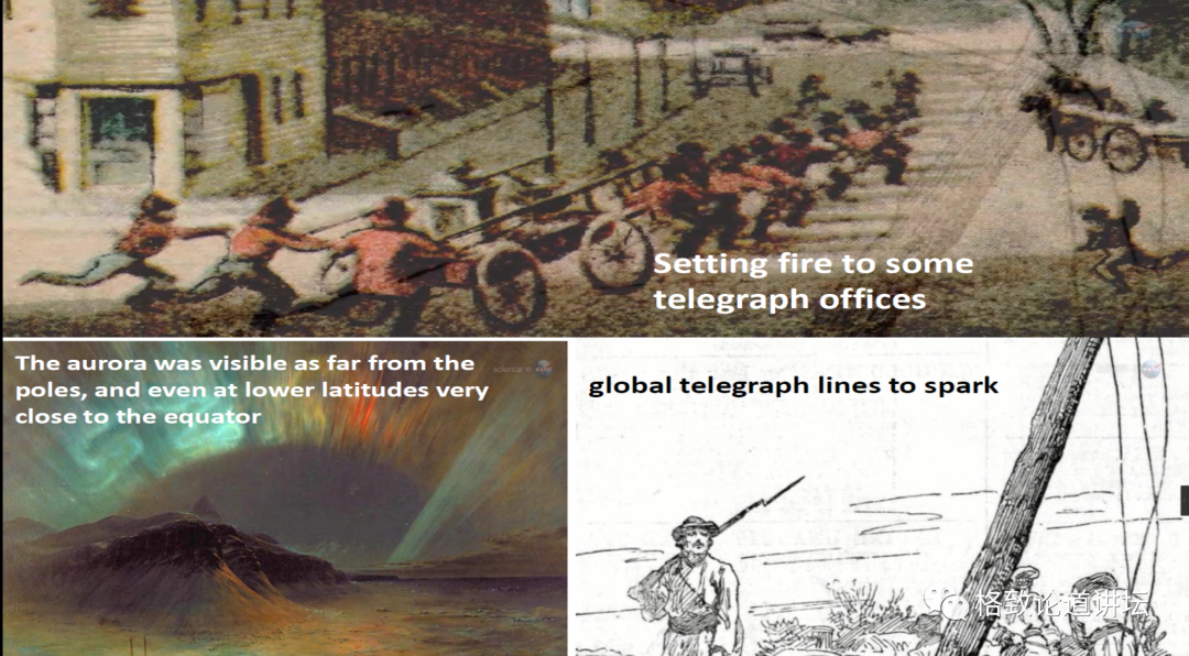 这是当时欧洲人绘制的图画,有一幅油画是消防队员正赶到电报局去灭火。另外左下角这个是极光,当时从极区开始一直到赤道附近的萨尔多瓦都观测到了极光现象。极光一般只有在南北极才有,是高能粒子沿着地球的磁力线从极区流下的时候,使得中性大气电离又复合后产生的一种绚丽的光学现象。