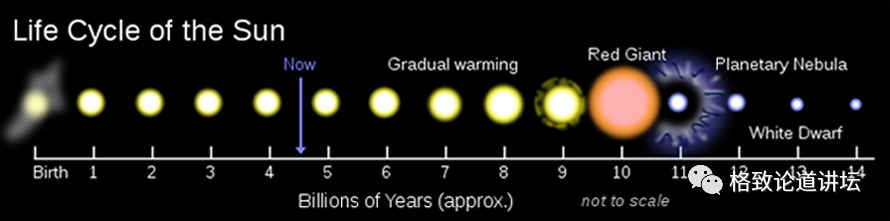 这是太阳的生命周期,所以我们要理解,太阳也像其他的一切事物一样,有生、有死,有生命周期。