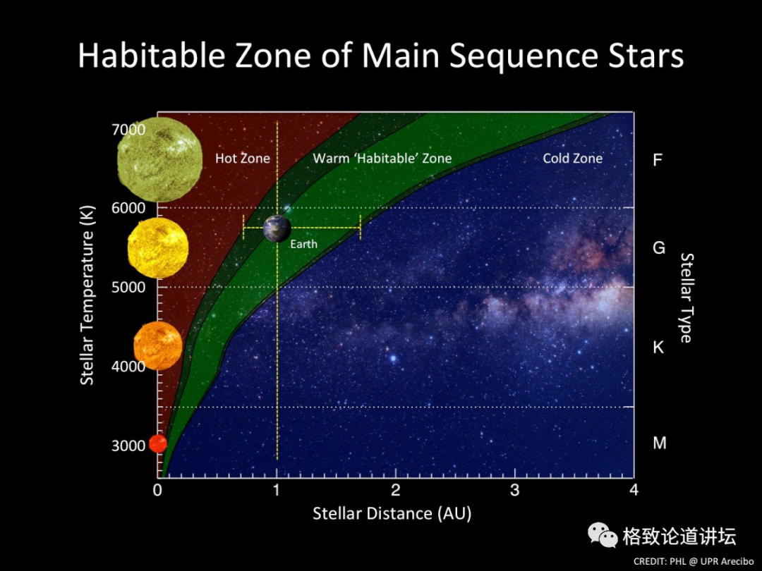 在过去十多年来,任何一个恒星都有一个生命宜居带这一发现是很重要的成果。我们可以看到不同类型、不同表面温度的恒星,都有用绿色来表示的生命宜居带。太阳属于G2V型的恒星,地球正好在它的生命宜居带内。