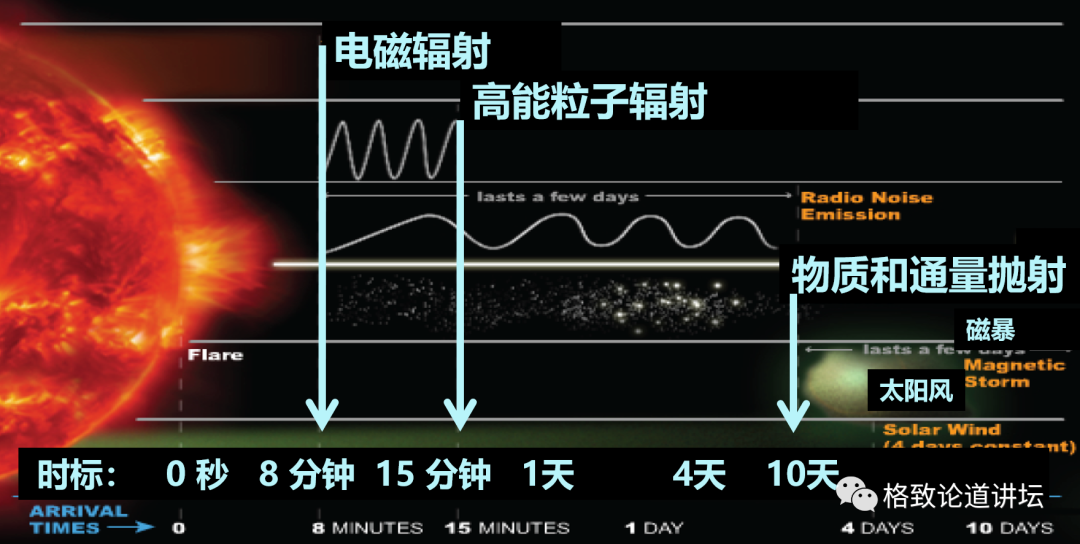 电磁辐射用8分钟就可以到达地球,高能粒子辐射最快的大概十几分钟可以到达地球,慢的则需要用一两天。物质抛射和磁云大概在2-4天的时候会与地球的磁层发生碰撞。