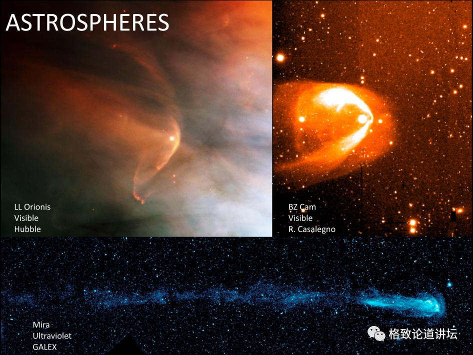 这是用哈勃望远镜观测的另外两颗恒星LL Orionis和BZ Cam的“日球系统”。对恒星来说,是恒星和天球(star & astrosphere)与太阳和日球(sun & heliosphere)都是一样的,只不过一个是对恒星而言,一个是对我们的太阳而言。