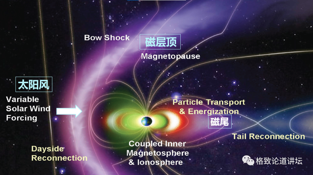 这些剧烈的活动没有伤害到人类的一个重要原因是,地球用一个很强、很厚的磁层把自己保护起来了。这里有磁层顶、磁尾,太阳风和磁层顶之间形成了弓激波,它把太阳的高能粒子屏蔽在外,让它不至于进入到地球空间。除了从磁尾通过地球极区进入地球大气的高能粒子之外,其他的地方都是安全的。人类得以生存跟这有很大的关系。