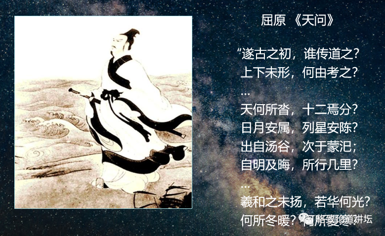 在两千三百多年前,伟大诗人屈原在他的著名诗篇中提出了许多问题,包括宇宙早期如何由混沌变为有序、宇宙的结构、时间的划分、日月的归属、恒星的分类以及太阳运行的特征、太阳从升到降到底走了多少里。这些问题当中有一些跟现代自然科学有很紧密的关系。