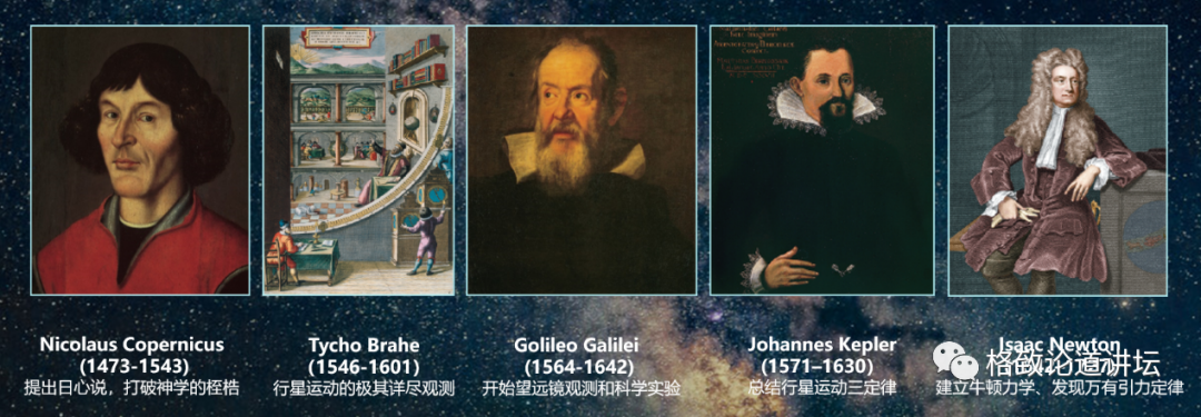 在后来的两个世纪里,第谷对太阳系行星运动做了极为详尽的目视观测;开普勒借助他的观测总结出了行星运动的三大定律;伽利略是第一个开始用望远镜观测太阳系天体的人,同时他又进行了自由落体等科学实验;集大成者是艾萨克・牛顿,他总结行星运动的三大定律提出了万有引力定律,另外又建立了牛顿力学。他和莱布尼茨等其他学者一起发展了微积分,拉开了现代科学和工业革命的序幕。