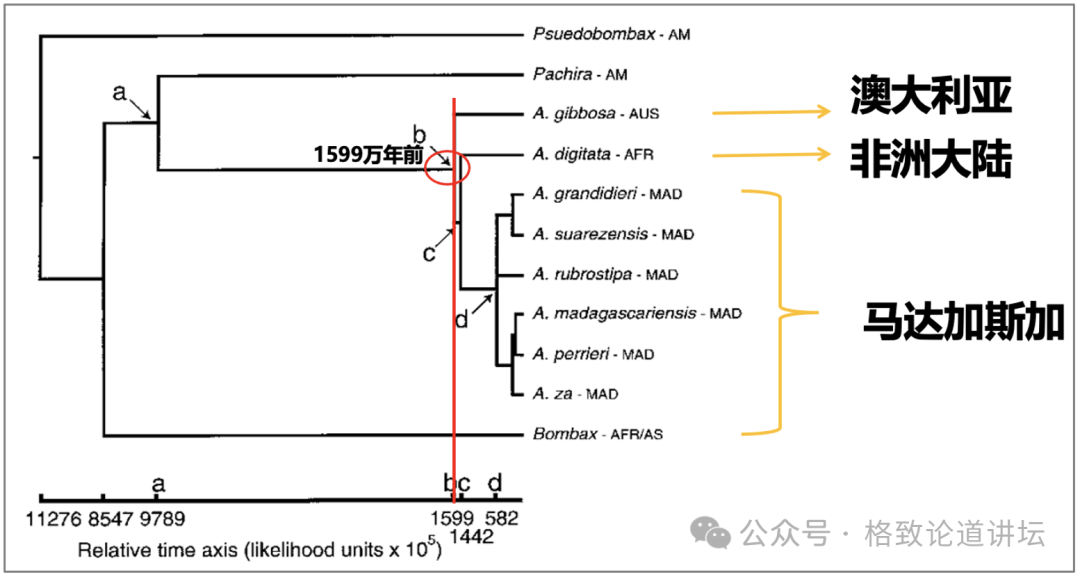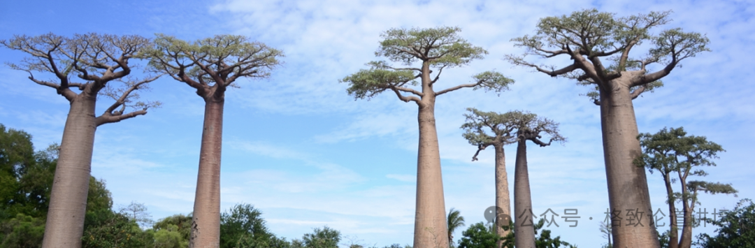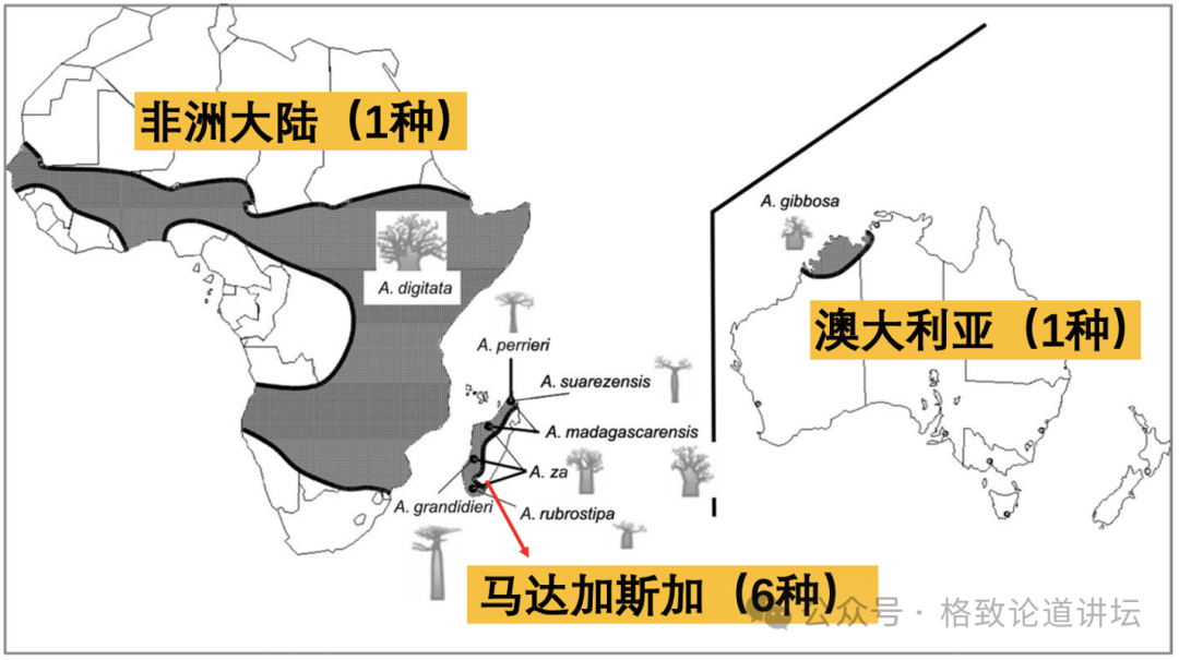 这张图可以清晰地看到,猴面包树在非洲只有1种,在非洲的马达加斯加岛有6种,而在离非洲非常遥远的澳大利亚还有1种,这种近缘物种不连续地分布现象在生物地理学上被称为间断分布。