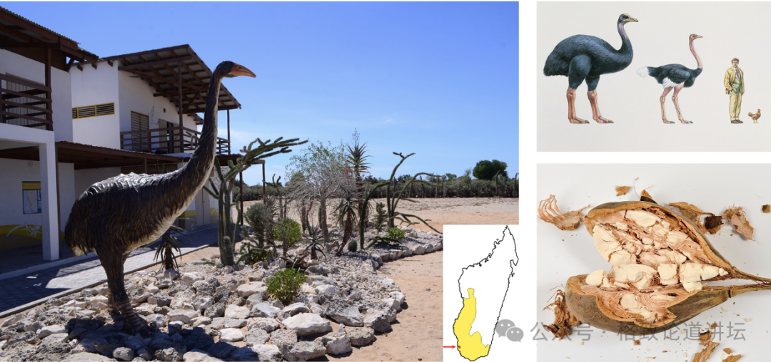 象鸟跟猴面包树有什么样的关系呢?象鸟在猴面包树的果实掉落以后,会用它巨大的脚趾一脚把果实踩烂,踩烂了以后,它就会通过嘴来啄食。随着它迁徙,猴面包树的种子就会随着粪便排出来,帮助猴面包树进行传播。