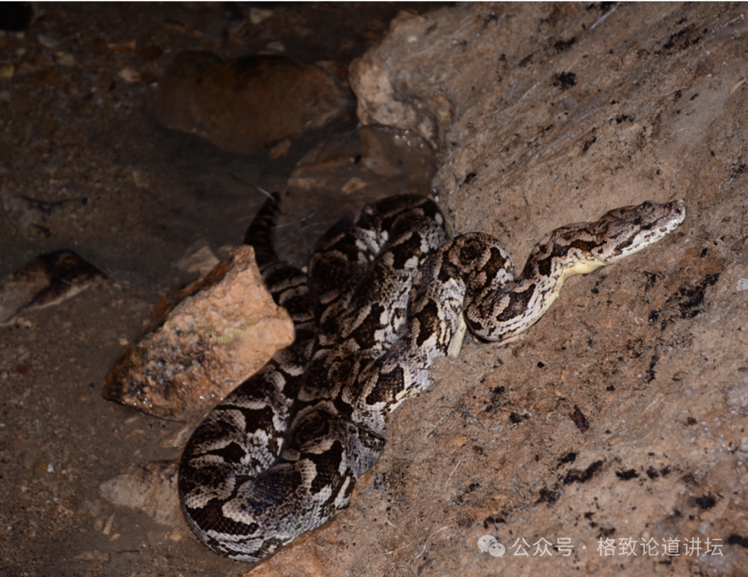 于是我就在旁边转悠,在离“老奶奶”树差不多100米的地方发现了一个山洞,里边非常昏暗,但是我能听到水流的声音,于是就准备进去洗个脸,顺便休息一下。我走到水边的时候,被一个庞然大物吓了一大跳,仔细一看,原来是一条大蟒蛇,和我一样也热得在那里避暑纳凉,吓得我赶紧往洞外面跑。