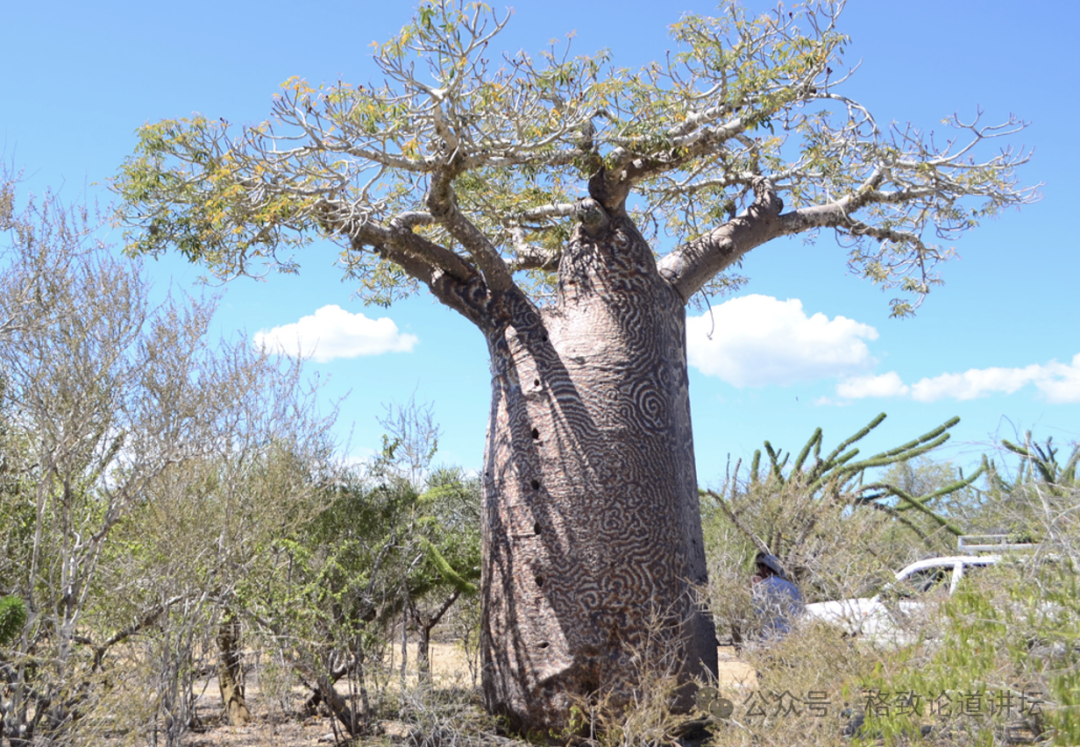 继续往内陆走,我们还看到了另外一棵大猴面包树,跟猴面包大道上是同样一个物种。让我们非常惊讶的是,这棵树的树皮上长满了像国画里祥云的图案,很难想象这种图案是在自然情况下形成的。