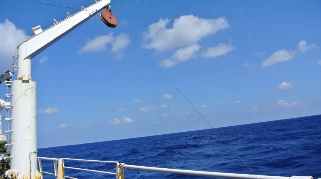 到达作业站点的时候,天公作美,天气还是不错的。我们下放了主要的观测设备温盐深仪(英文缩写为CTD),这个设备是用来观测海水温度、盐度和压力变化的,同时它还要采集海洋里不同深度的海水,这是我们的基础调查数据之一。
