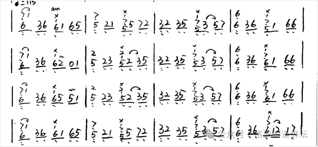 我把这一段的谱例翻译成了古筝使用的简谱,然后在需要使用AM技巧的地方画了一个叉标注。要用古筝达到这个效果是不是可能呢?