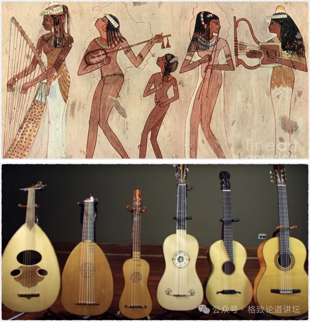 下图中最左边是乌德琴,第二个是鲁特琴。这两个乐器依旧保持了泪滴状的琴箱。到了文艺复兴时期,吉他的雏形就出现了,有了一个沙漏型的小蛮腰。为什么在形制上有这么大的改变呢?学界认为在那个时候,大家想要更容易地怀抱吉他进行弹唱,出于当时人们出行便利的需要,所以它的琴箱变小了。