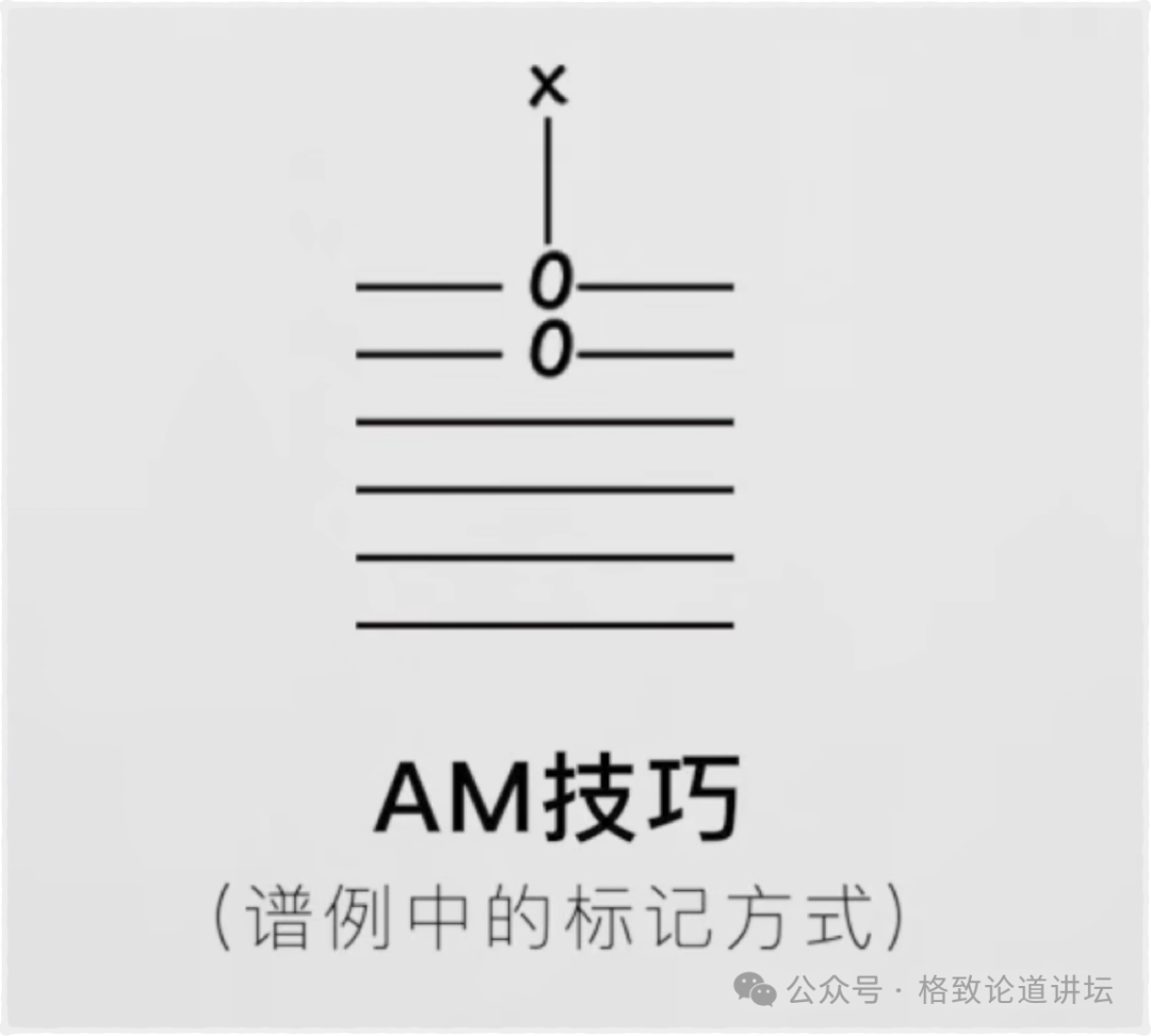 我们就讲两个示例,第一个是AM(Attack Mute)技巧。AM技巧指用无名指击弦加小指打板来拍击吉他琴箱的位置,就可以同时产生一个有旋律的、有音高的乐音以及一个打击乐的音效这两个声部。
