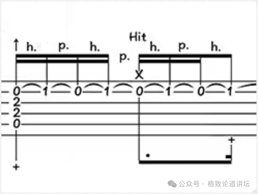 下一个技巧是击勾弦(Hammer & Pull-off)以及打板(Hit)。打板比较好理解,就是击打古筝的琴盖来代替击打吉他琴箱。