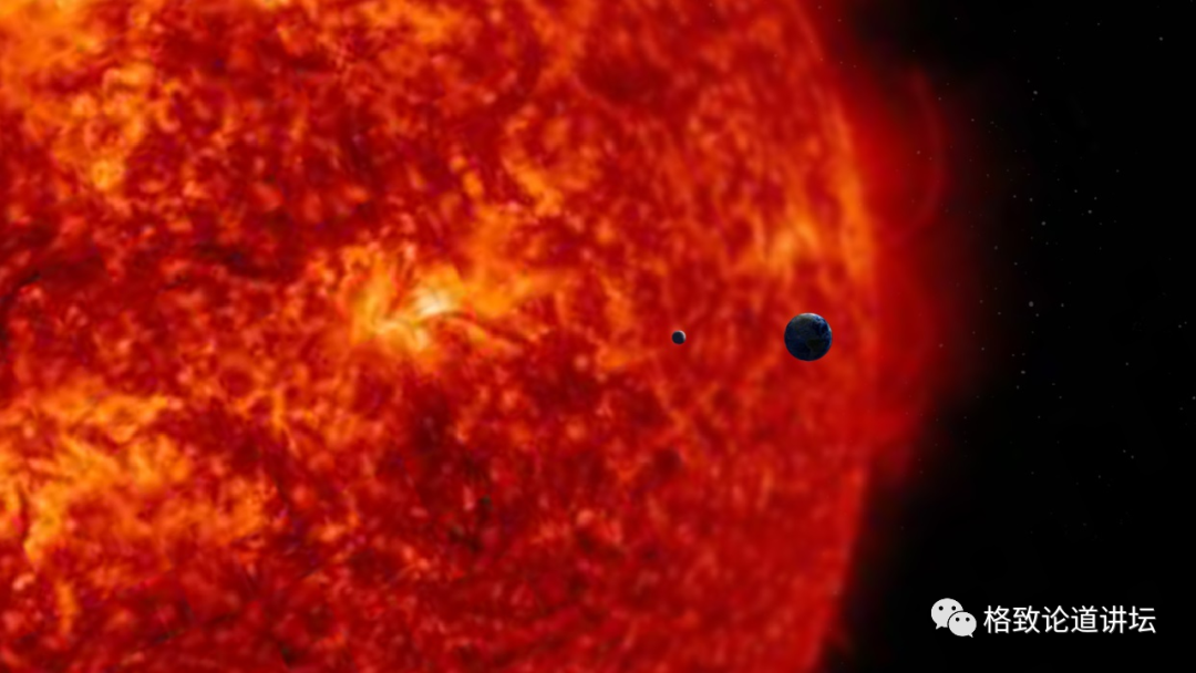 还有一个百年一遇的天文奇景。相对于火星而言,地球属于内行星,所以难得一见的奇景就是看地月系统凌日。两个小点从太阳表面上缓缓滑过,大概三个小时左右的时间。有的时候比较远,会横跨整个太阳的表面(上图),也有的时候相对来说距离比较近(下图)。