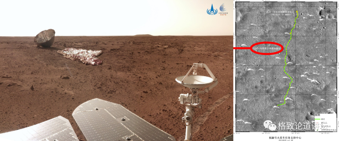 现在火星车已经工作了100天,走了1000米。在火星车走过的路的中间位置,我们还去看了一下落在火星上的背罩和降落伞。