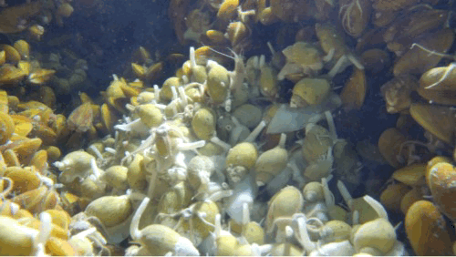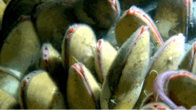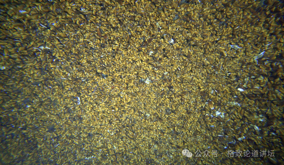 随后就有贻贝来生活,它和这种细菌是共生关系,一个提供物质营养,一个进行食物加工。我们能看到一大片密密麻麻的贻贝,就是因为它能充分利用海底的物质能量进行生长和繁衍,是这个生态系统的优势物种。