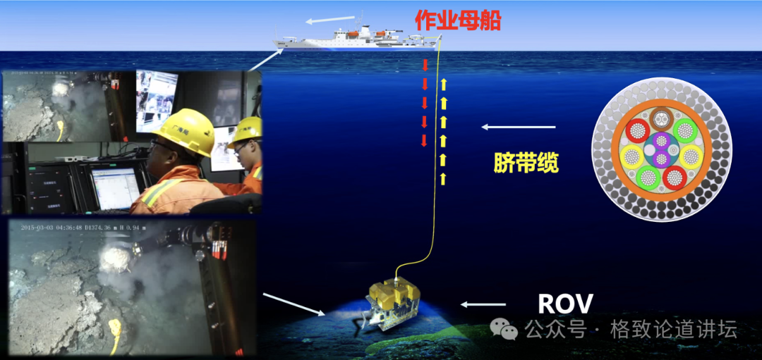 这种潜水器的最大特点就是有一个“脐带缆”,就像婴儿连接母体的脐带。母船给它供电,它把海底的信息传输到母船,船上的工作人员就可以实时看到深海所有的景象,还能在船上遥控它,代替人到深海里面去干活。
