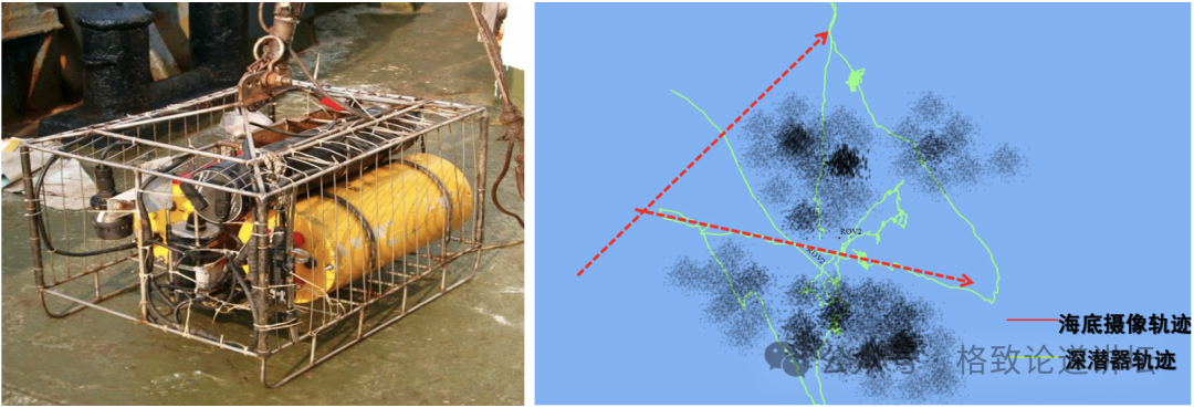 这就是我当时用来在海底拍摄的设备,但它没有动力,只能随波逐流,有点类似于放风筝。右边是我们做的一个示意图,红色的轨迹就是海底摄像的轨迹,它一走就过去了,想再回过头看是不可能的。而我们希望深潜器是精准可视、可控的,可以对一个地方进行反复精细的调查,就像绿色的轨迹那样。