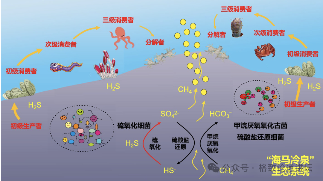 为什么会存在这么多的生物呢?简单来说,这里有一种能吃气体的细菌,可以把海底的“甲烷气体”转化成糖或者有机物,为海底的生物提供能量,形成一个“黑暗”的生态系统。