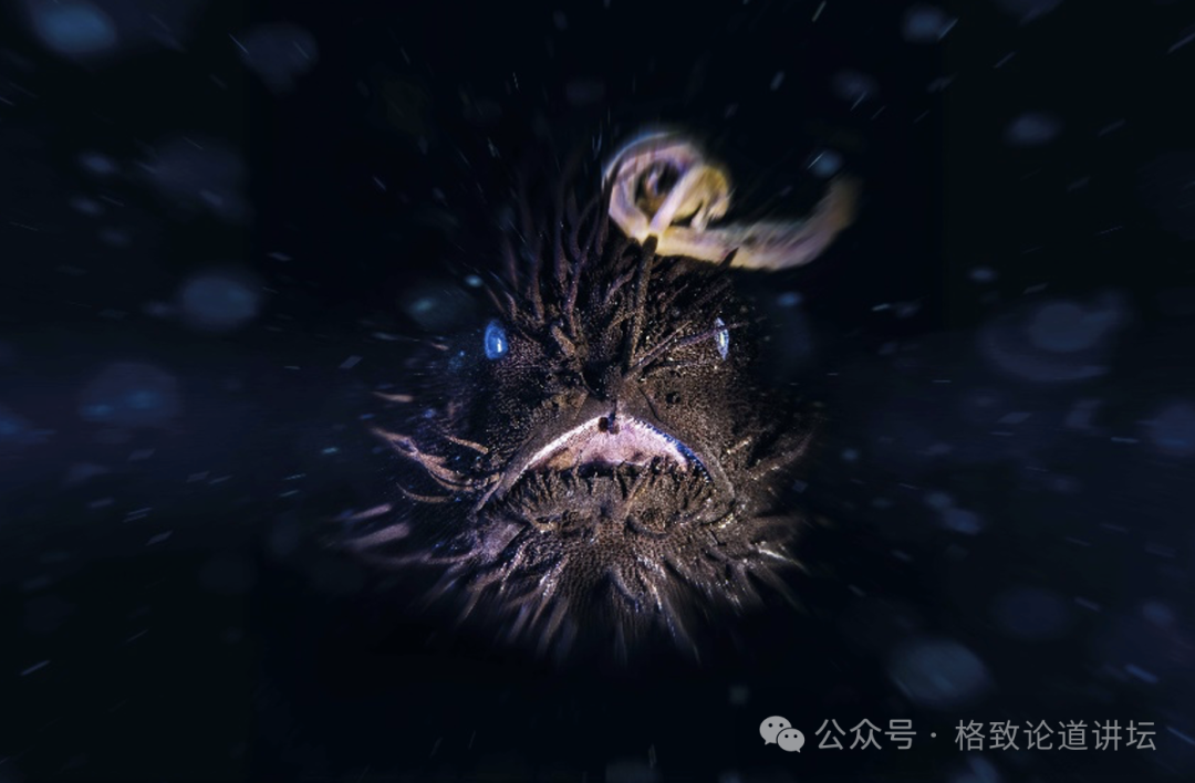 这幅展现了狩猎中的鮟鱇鱼,拍摄的时间是2016年。可以说这个场景颠覆了我以前的认知,因为鮟鱇鱼的头顶好像长了一根棍子,就像钓鱼的鱼竿一样,而且上面还自带诱饵,我们把它叫拟饵。很少有小鱼能够逃过这样的诱惑,所以我把它命名为叫《杀机重重》。