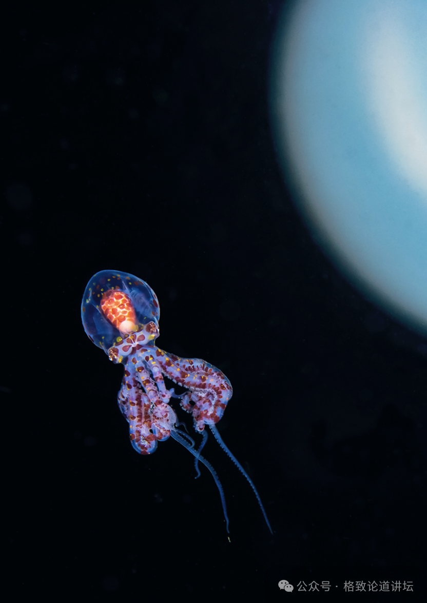 当时同行都一起在拍,右上角的白色部分实际上是同行摄影师闪光灯的灯罩,我在后期剪裁的时候保留了一小部分,让它看上去像是月亮。而斑马章鱼头上那个透明的头盔就好像宇航员,所以我把它取名为《月下漫步》。