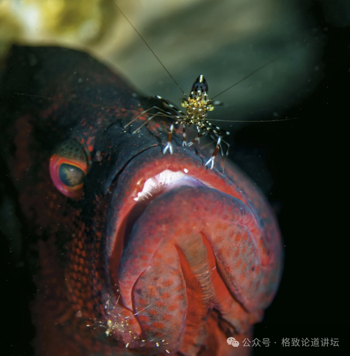 比如这个石斑鱼头上的清洁虾。石斑鱼是大家都很熟悉的海洋生物,这个拍摄点在30多米深的水下,被潜导叫做石斑鱼的清洁站,因为这里会有一些虾定时给鱼进行清理。