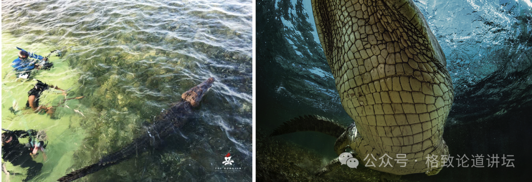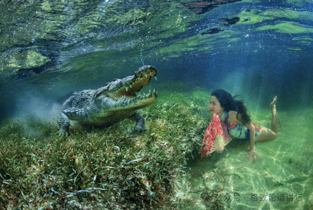 这幅片子大家的质疑就更多了。南美的咸水鳄是海里面最凶狠的动物之一,但这位中国美女却离它那么近,很多人都觉得是后期P上去的。