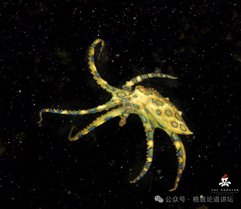 这是因为蓝环章鱼平常并不会漂浮在水中,基本都在海底礁石上。当时刚好是机缘巧合,一股水流把它升了起来,我们踢脚蹼躲避它时,水流又把它往上升了一下。当时我们几个同伴一起拍它,就得到了这幅照片。其实我们非常后怕,它毕竟是剧毒的。