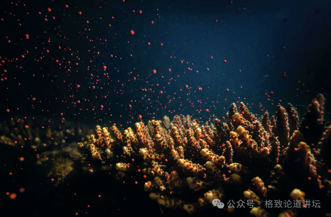 这幅作品是我2023年在大鹏半岛海域拍的,是正在产卵的霜鹿角珊瑚。当时这个场景让我非常激动,因为这正是“潜爱大鹏”数千名义工长期保护海洋的结果。在深圳的大澳湾,多年前就人工设置了苗圃,把受伤珊瑚的残枝移植苗圃上。经过多年的保护生长,它们终于在去年开始产卵了。