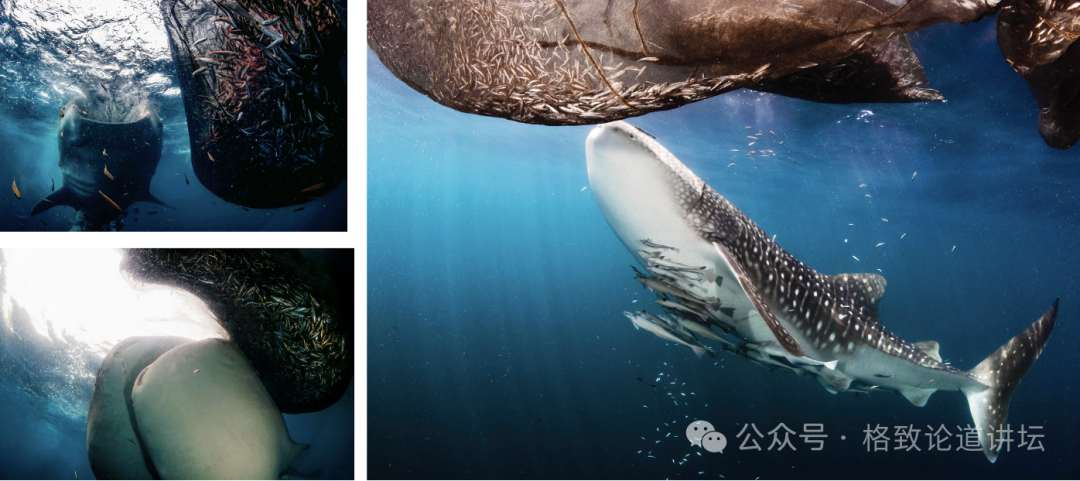2017年,我在参加一次船宿潜水的时候拍了这一组《乞讨的鲸鲨》。鲸鲨是海洋里面最大的鱼,跟用肺来呼吸的鲸是不一样的,它是真正的鱼。但作为海洋里的庞然大物,为什么会落到今天这样的田地呢?因为人类用网把这些鱼、虾一网打尽,它们没有食物可吃,只能向人类乞讨。我们到底做了什么,把它们变得像弃儿一样可怜?