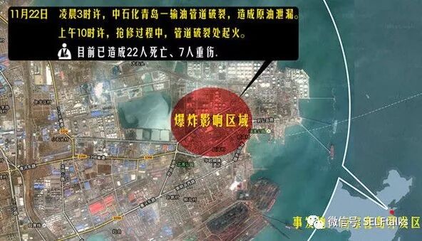 这幅图是2013年11月22日的青岛市黄岛区。黄岛区有一个特点,地下有很多长输埋地管线,用来运输石油和天然气。就在11月22日这一天,其中一根管线因为腐蚀,发生了穿孔泄漏,石油源源不断地流入地下,而且鬼使神差地流到了市政管网中去。