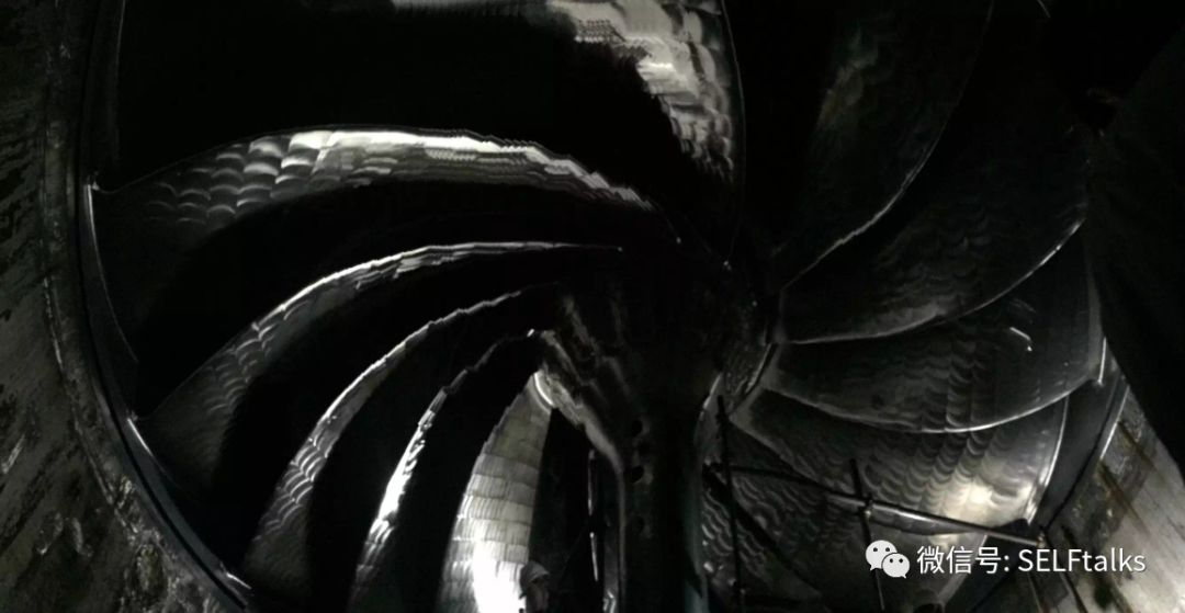 这个大家伙是三峡集团用来发电的一个水轮机。当水流冲刷叶片时,带动水轮机旋转,将动能转换成电能。水轮机很大,直径有20多米长,人站在它的面前显得非常渺小。