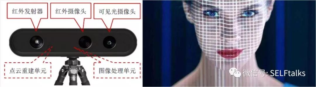 它同样是红外光,也同样有至少两个摄像头,一个是可见光摄像头,一个是红外光摄像头,但是这个光跟刚才不一样,它是有结构的,比如说二维的点阵。