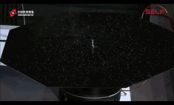 我们再把频率调高一下看一看。看!这些食盐颗粒它发生了移动!自己跑了!大家可以想想这是什么原理?我们继续调高频率看看花纹还会变──大家看这个图案越来越复杂了,大概有一圈、两圈、三圈、有四圈了。但是这个图案还会继续变的──因为随着频率的提高,波长会变短,有限范围内它会出现更多的花纹──看这个花纹变得越来越复杂。
